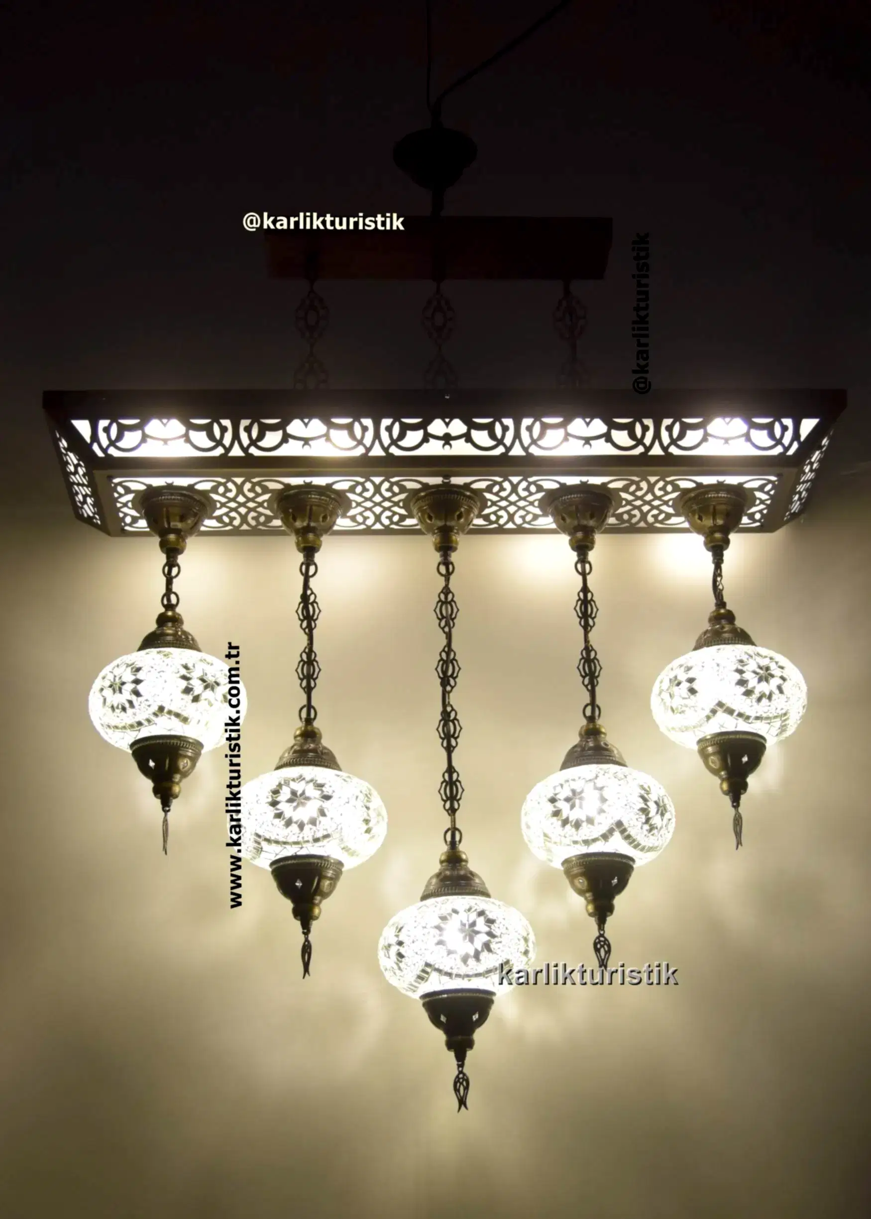 Osmanlı tarzında el yapımı **5 li sarkıt avize**, yemek masaları, mutfak tezgâhları, bar ve restoran dekorasyonu için özel olarak tasarlanmıştır.