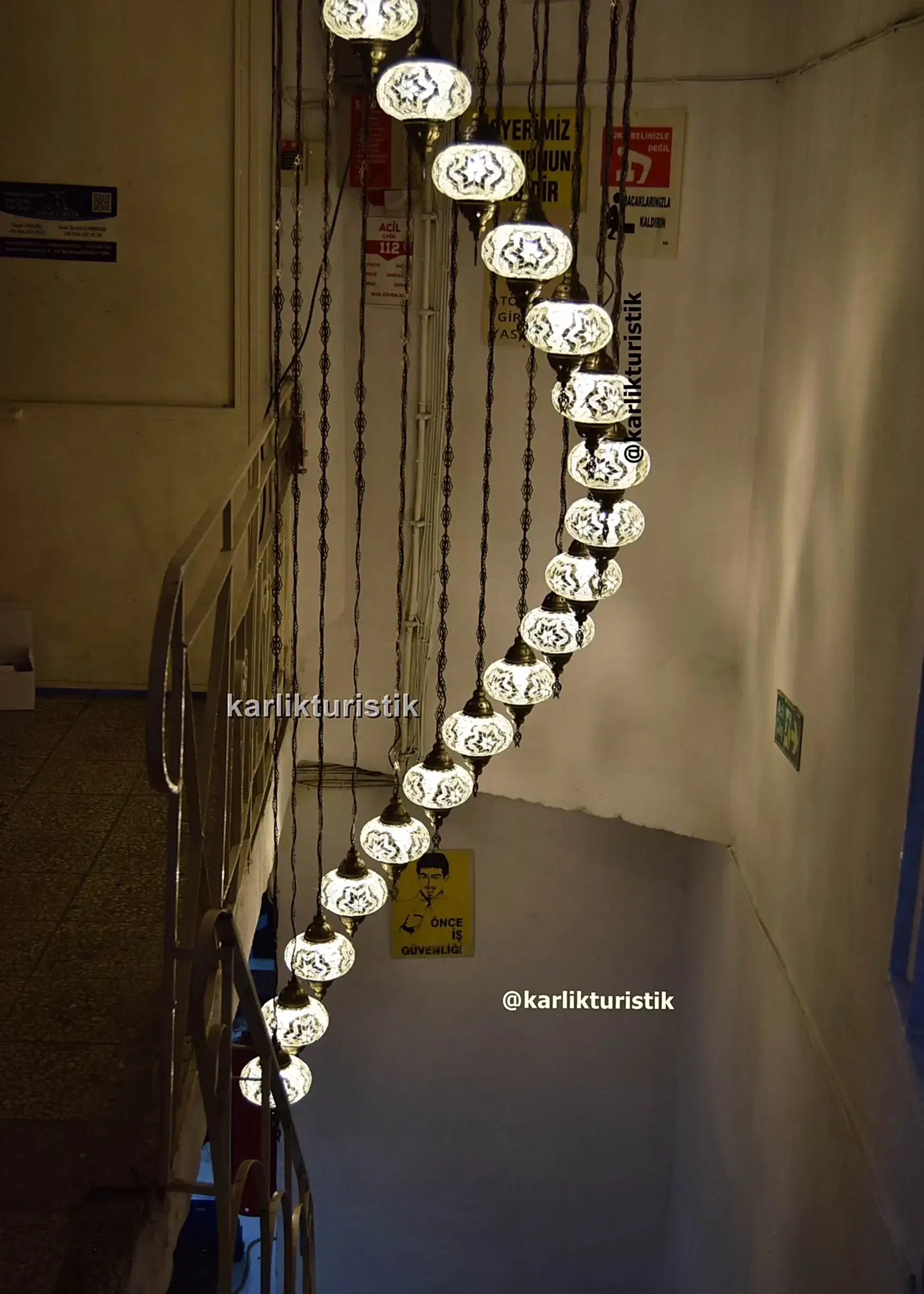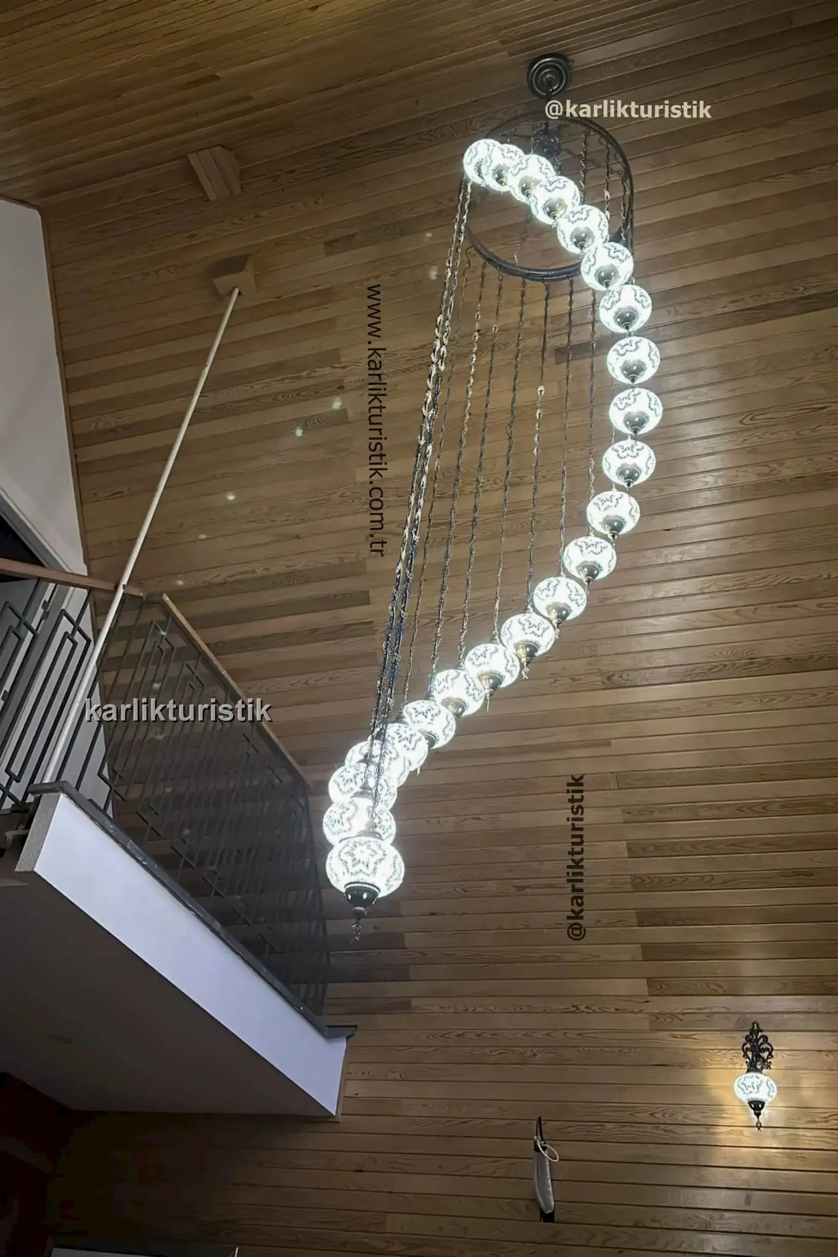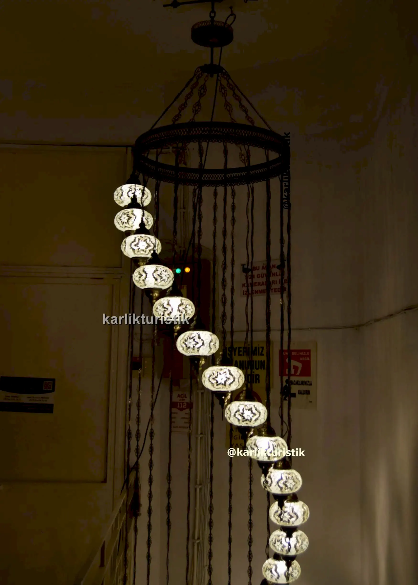 Merdivenlerden inerken veya çıkarken, avize büyüleyici bir renk ve gölge oyunu yaratarak mekanı sıcak ve ışıltılı bir ışıltıyla doldurur. Sadece bir ışık kaynağı değil; aynı zamanda miras, zanaatkarlık ve otantik Türk sanatının hikayesini anlatan bir merkez parçasıdır.