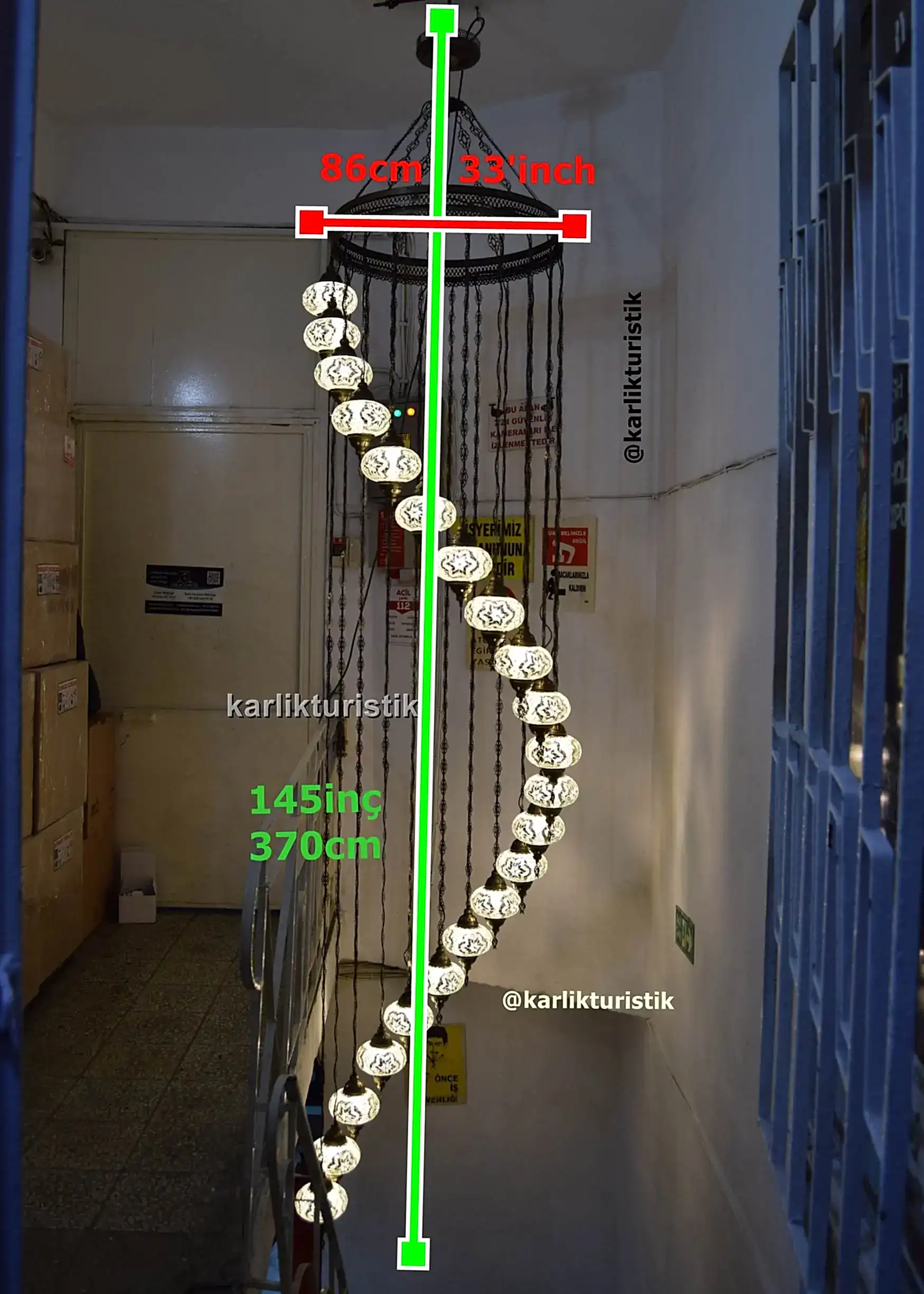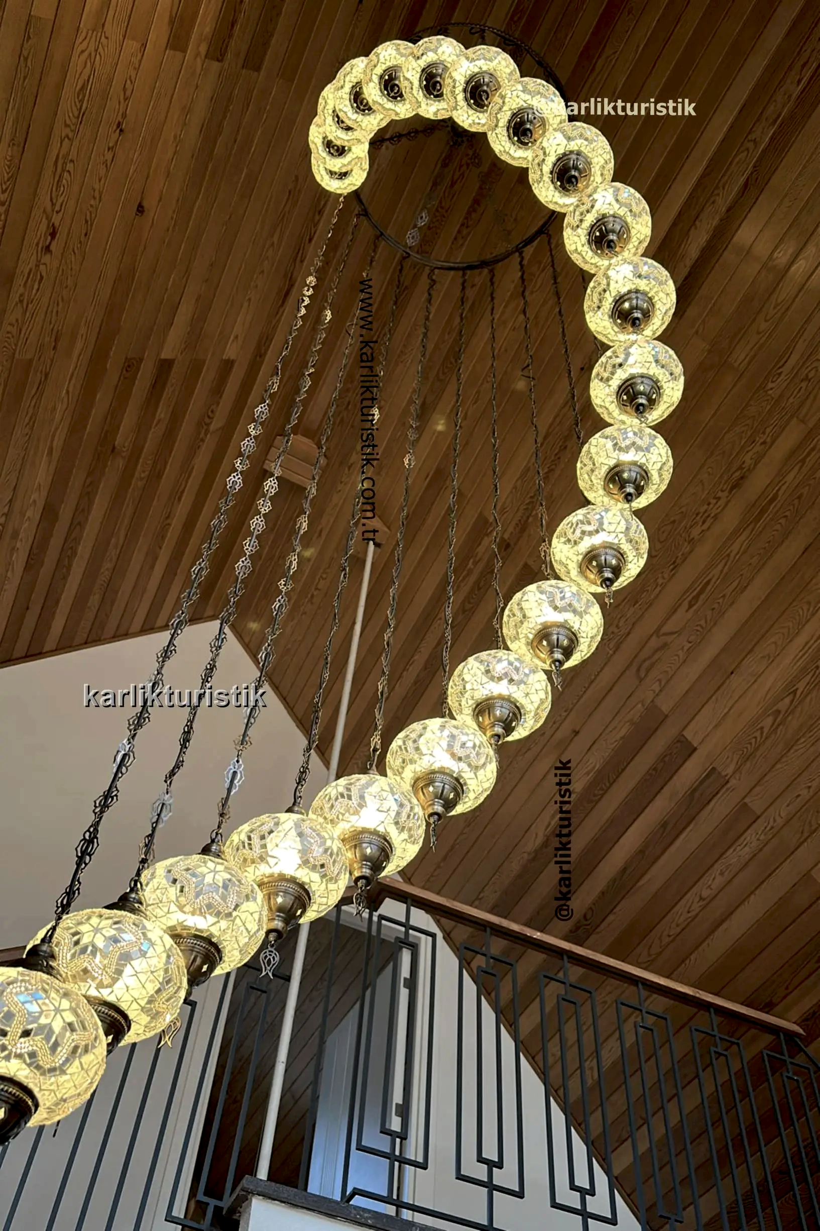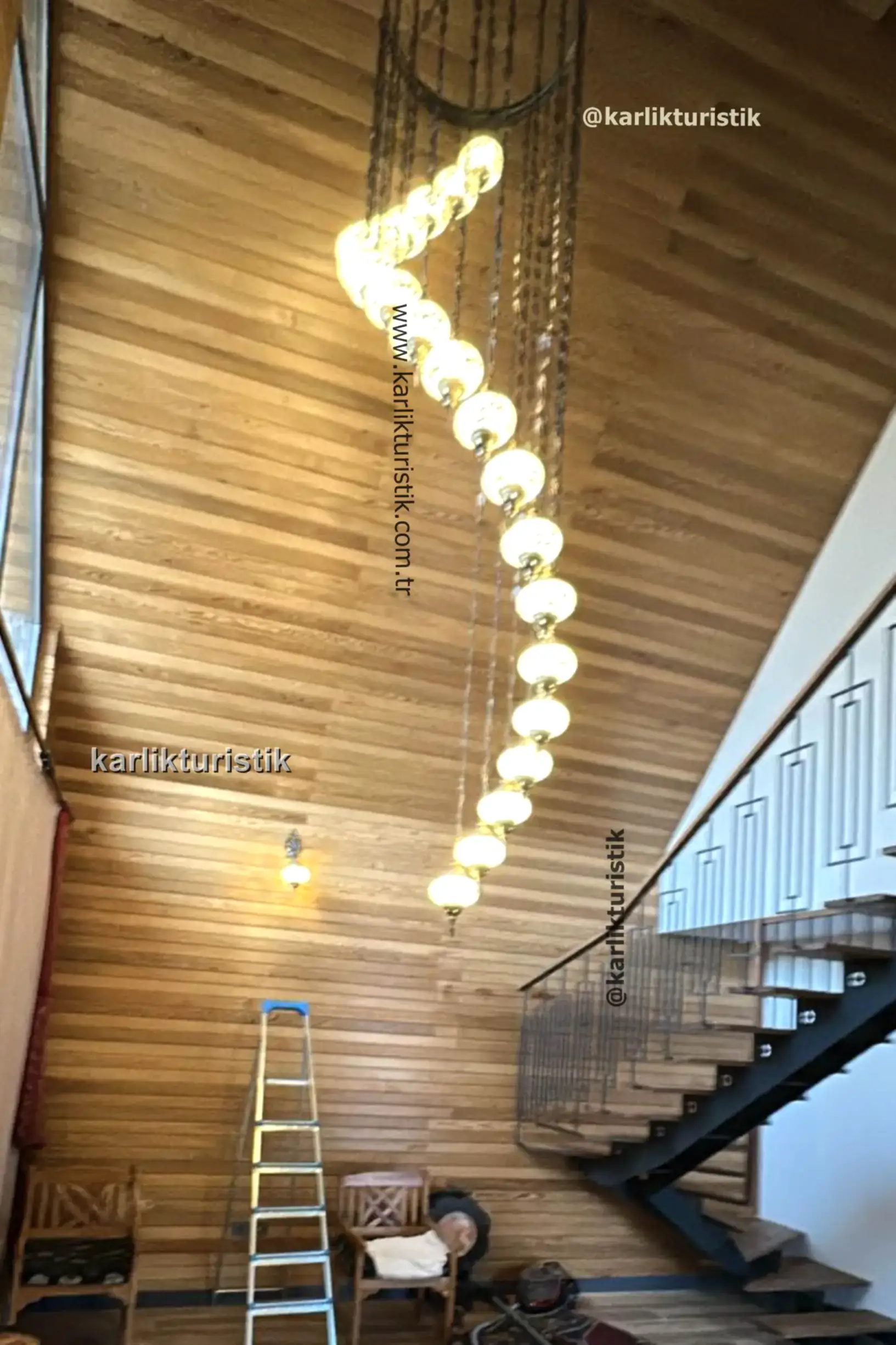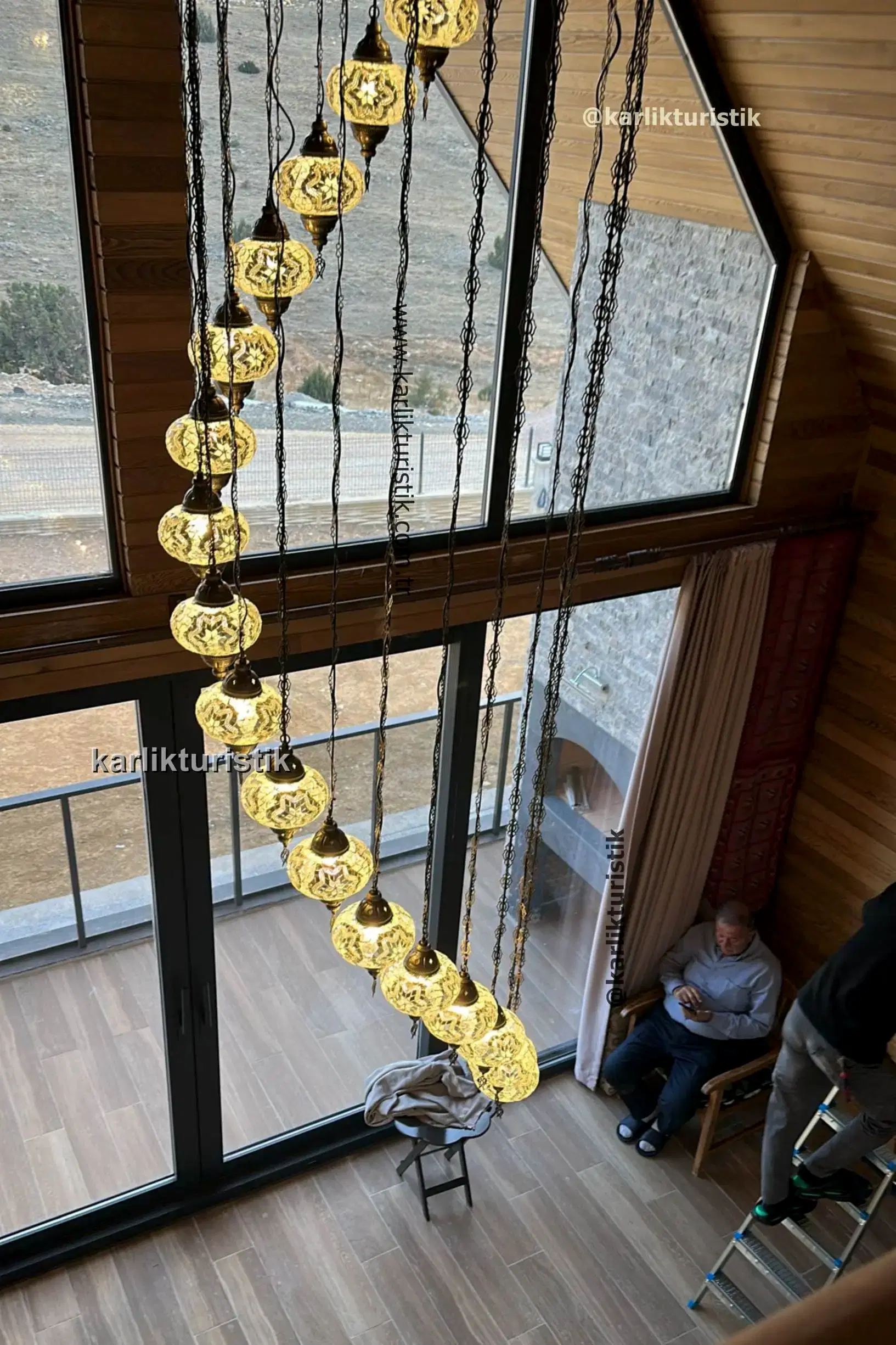 Merdivenlerden inerken veya çıkarken, avize büyüleyici bir renk ve gölge oyunu yaratarak mekanı sıcak ve ışıltılı bir ışıltıyla doldurur. Sadece bir ışık kaynağı değil; aynı zamanda miras, zanaatkarlık ve otantik Türk sanatının hikayesini anlatan bir merkez parçasıdır.