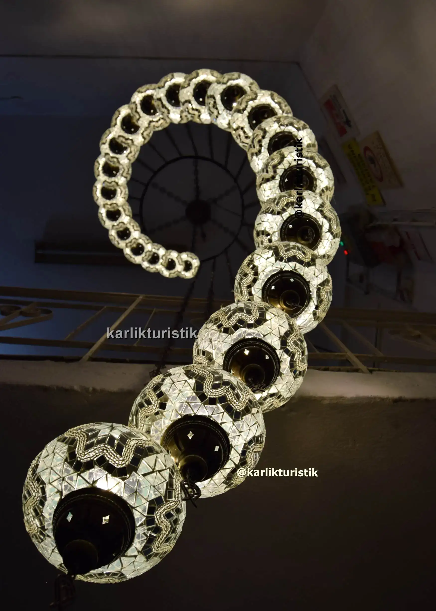 Villa Avize, Spiral Sarkıt Lamba 22 Parça El Yapımı Türk Mozaik Merdiven Avizesi, beyaz mozaik